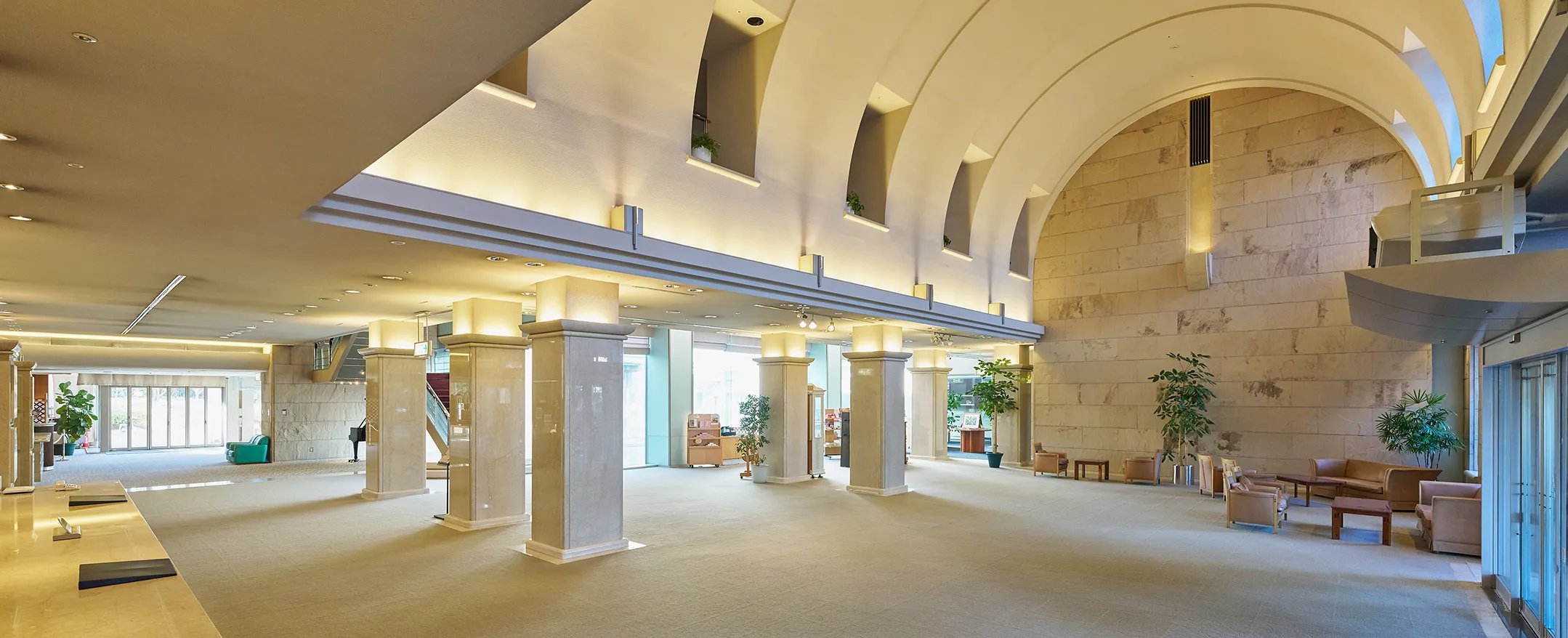 開放感あふれるダイニングや県産ワインを愉しめる眺望自慢のバー、やわらかな泉質の温泉大浴場、ラウンジや売店、バンケットルームまで幅広く完備