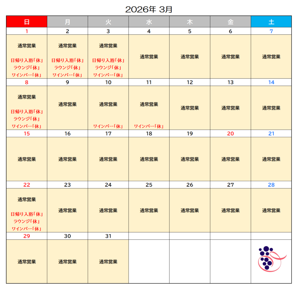 営業カレンダー / 各施設 営業時間のご案内